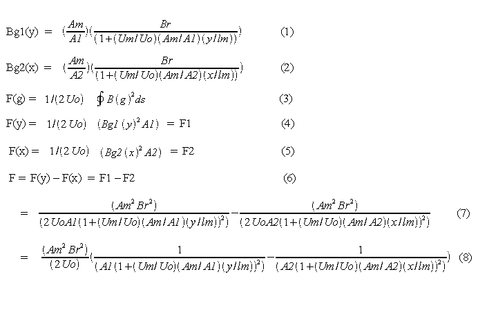 Here we derive the equations for the flux density in each air gap and the force acting on each side of the armature. From equation (8) below, if the air gap lengths x and y are equal the net force on the armature is in the – x direction, F2 > F1, since A1 > A2. If we make the air gap lengths equal and change only the air gap areas, the change in force to change in areas is linear and less than one-to-one. For instance, if A1 = 5(A2), then F2 = 2.69(F1). Bummer, but still may be useful. The relationship of the forces with respect to air gap length is non-linear second order (square in the denominator). So, for the areas in the instance above, we would have to move the armature in the positive x direction by a factor of 1.63 to make F1 = F2 and F = 0. This would be a relatively small change in air gap lengths.