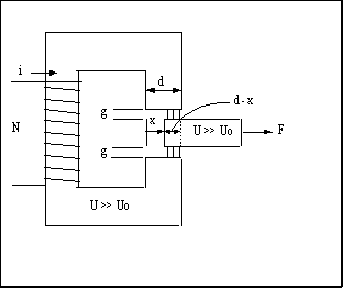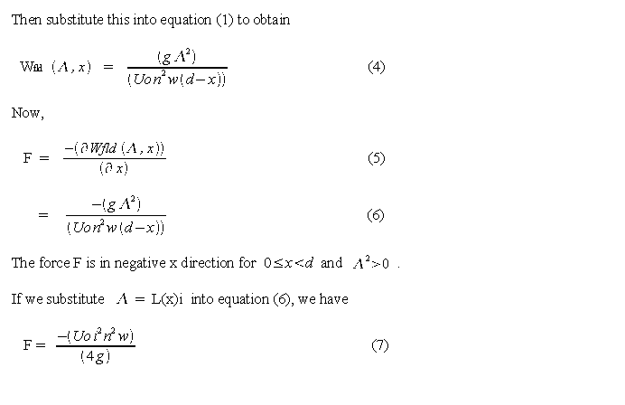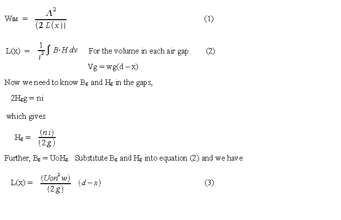 Equation (6) shows that F increases as x approaches d. In an actual circuit like in Fig 4(a), F would reach a maximum at about x = d and would then decrease as x > d. Also not shown in these equations is that F goes to zero when the armature is fully in the air gap and x < 0, and F becomes positive when the armature begins to exit the air gap in the negative x direction.
